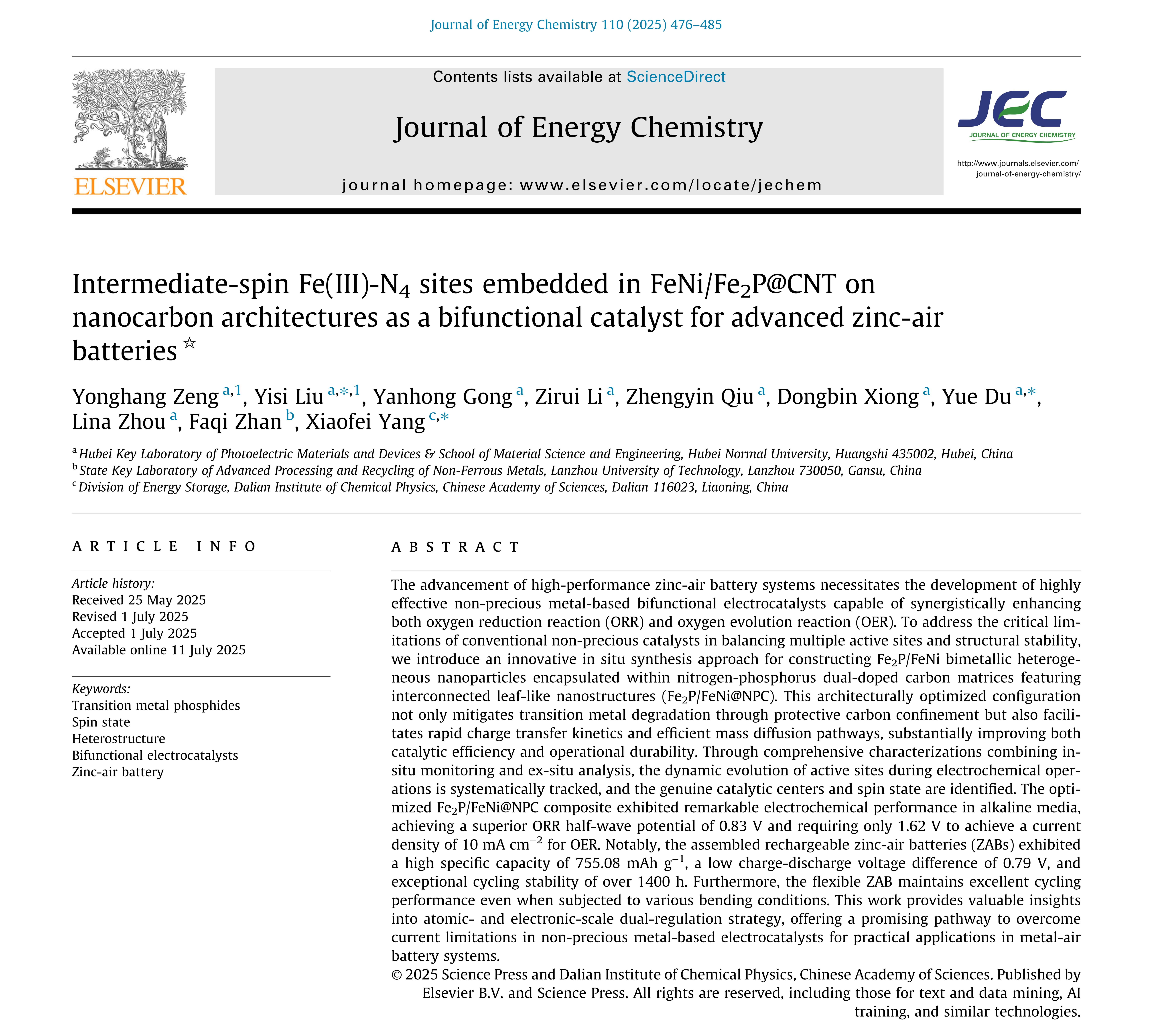 近日,我院刘易斯博士团队在金属空气电池氧电催化剂研究方面取得新的研究进展。相关研究成果以“Intermediate-Spin Fe(III)-N₄ Sites Embedded in FeNi/Fe₂P@CNT on Nanocarbon Architectures as a Bifunctional Catalyst for Advanced Zinc-Air Batteries”为题发表在国际知名期刊Journal of Energy Chemistry期刊上。Journal of Energy Chemistry(JEC)由中国科学院大连化学物理研究所与科学出版社主办,在能源化学、催化与电化学等交叉领域具有重要学术影响力,影响因子为14.9,中科院一区TOP。我院2023级硕士生曾永航为论文第一作者,刘易斯博士为该共同第一作者及通讯作者,yl6809永利官网集团为第一通讯单位,该研究得到光电转换材料与器件湖北省重点实验室平台支持。