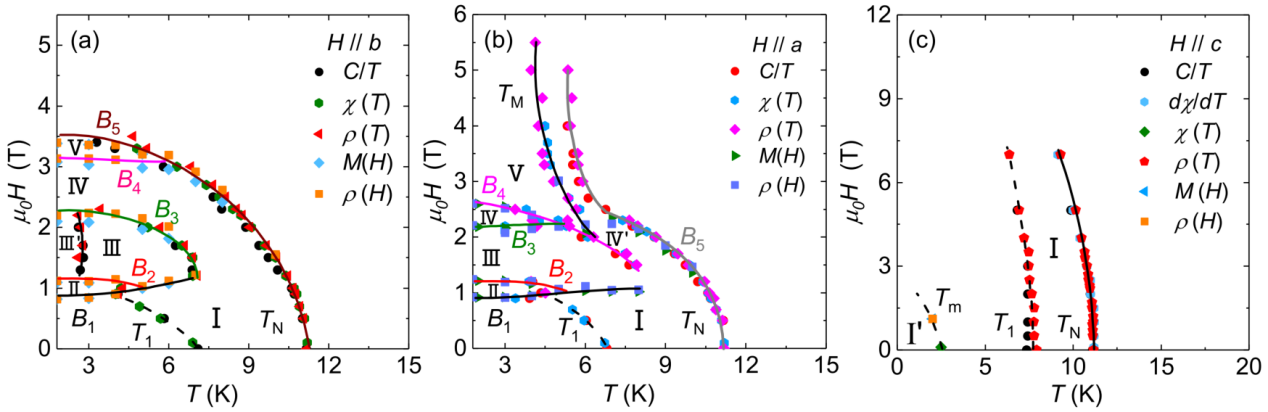 成果三:笼目型(Kagome)自旋冰是一种具有特殊几何阻挫特性的磁体,这种材料在低功耗数据存储、量子计算、极低温制冷等领域具有重要的应用价值。然而,早期的笼目型自旋冰主要发现于加场下的烧绿石型自旋冰、人工自旋冰中,缺乏在天然的材料体系中的发现,从而限制了相关领域的研究。近期,人们通过中子散射实验,首次在具有畸变笼目晶格的HoAgGe中观察到了笼目型自旋冰态,并且在其自旋冰态中观察到了以反常霍尔效应为特征的退简并现象。为了进一步揭示笼目型自旋冰态的磁性特性,本研究通过自助熔剂法生长了HoAgGe单晶,并通过在不同磁场下的物性测量,系统研究了HoAgGe中的自旋冰态随不同磁场的演化行为。当沿ab平面内施加磁场时,存在多个磁场诱导的变磁相变和复杂的磁场-温度相图,与其磁场诱导的自旋冰态相对应。相比之下,其磁场沿c方向的磁性行为相对简单,与其Ho3+磁矩的伊辛特性一致。此外,我们还发现HoAgGe在高场下存在明显的面内各向异性,在磁场沿a和b方向上表现出迥然不同的磁场-温度相图,存在截然不同的磁构型。相关研究工作为研究笼目型自旋冰特性、探索新奇物态、发展自旋冰模型提供了重要的实验依据,该研究成果以“Complex magnetic phase diagram of the metallic kagome ice HoAgGe”为题发表在2025年的Physical Review B上,其中我院研究生李纪元为论文第一作者,我院张勇军博士和浙江大学宋宇教授为论文通讯作者。