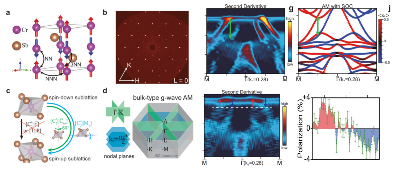 成果一:近年来,一种被称为交错磁性的共线磁性引起了广泛关注,交错磁性的发现被入选《Science》“2024年国际十大科技突破”。这种磁性具有动量依赖的能带和自旋劈裂,却没有净磁化,寻找具有接近费米能级大劈裂的交错磁性材料,对于其自旋电子学应用、制造高容量快速存储器件至关重要,但也具有挑战性。在本研究中,我们采用助熔剂法成功生长了高质量的CrSb单晶,并利用角分辨光电子能谱(ARPES)、自旋分辨的ARPES和模型计算,直接在CrSb中观测到了一个接近费米能级高达约1.0 eV的交错磁性自旋劈裂,以及验证了其费米能级附近自旋劈裂导致的自旋极化。值得一提的是,CrSb具有目前已知最大的交错磁性自旋劈裂,且具有高奈尔温度(705 K)、易于进行薄膜生长和大气下稳定等特点,这使其在交错磁性未来的应用上具有很大的潜力。该研究成果以“Three-dimensional mapping of the altermagnetic spin splitting in CrSb”为题发表在2025年的Nature Communications上,其中我院张勇军博士、浙江大学徐远锋教授和刘洋教授为论文通讯作者。