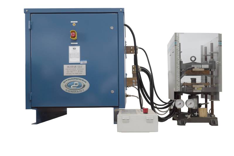 5. 结束后,电流旋钮回调至0,按红色STOP键,按仪器CTRL/SELECT键,右方Manual小灯亮,关掉热压电源,冷却水,结束热压。取6块方形石墨块,左右各放置3块,将模具放在方形石墨块上,加上小铁柱,施加压力直到将样品退出。