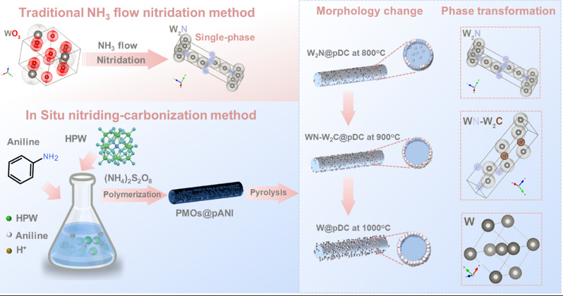 首先,杜岳博士采用化学氧化聚合法合成多金属氧酸盐@聚苯胺(PMOs@pANI)聚合物,以此制备了一系列的聚苯胺衍生碳材料,探究了杂多酸在高温条件下的相变行为,实现了W2C-WN异质结材料的可控合成。多金属氧酸盐在高温条件下可转变成六方相的W2C-WN异质结构,所制备的WN-W2C@pDC异质结复合材料由均一的纳米碳棒堆积而成,其中WN-W2C纳米颗粒嵌入在碳棒上。该结构材料的设计合成为构筑低成本、高性能的金属空气电池提供了一种新策略。相关研究成果以“One-step, in situ formation of WN-W2C heterojunctions implanted on N doped carbon nanorods as efficient oxygen reduction catalyst for metal-air battery”为题发表。文章链接:https://www.sciopen.com/article/10.1007/s12274-023-5501-