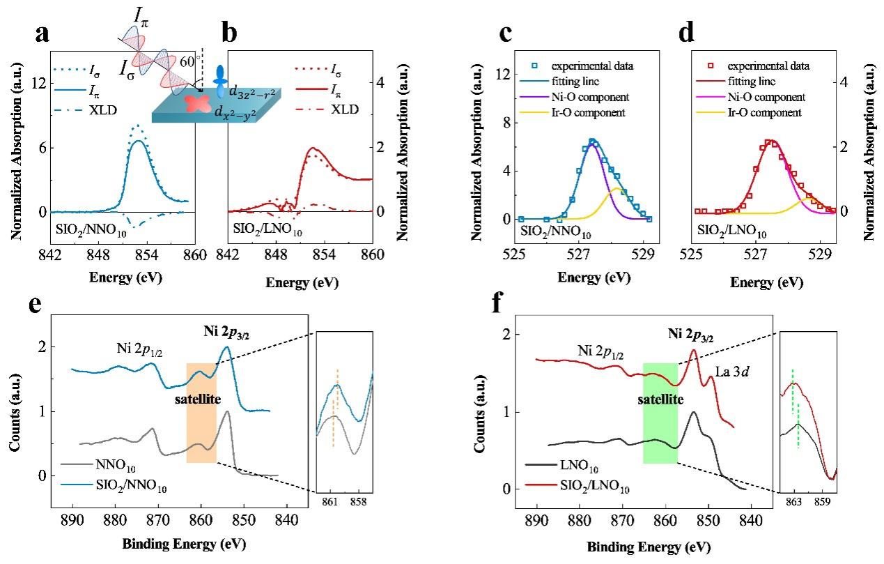 李尧博士等人借助脉冲激光沉积技术制备了SrIrO3/LaNiO3和SrIrO3/NdNiO3两类3d/5d过渡金属钙钛矿氧化物异质结,通过X射线吸收光谱发现这两类异质界面存在方向相反的电荷转移,并伴随着Ni的eg轨道极化和Ni-O pd轨道杂化的相反变化趋势,上述现象也被第一性原理计算的理论结果印证;随后,扫描透射电子显微镜观测到两类异质界面处的面外Ni-O键也出现了相反的伸缩。基于界面电荷转移的内建电场模型,异质界面的轨道和晶格重构得到了合理解释。此外,论文还从Ni-O pd杂化对电子关联能和自旋-轨道耦合能竞争的影响出发,对两类异质结构电、磁特性受到的调控进行了讨论。该项研究成果揭示了钙钛矿氧化物异质结构中的A位阳离子可以作为控制界面电荷转移方向的“旋钮”,3d/5d钙钛矿氧化物异质界面是研究各种序参量之间复杂相互作用和激发新颖界面效应的绝佳平台。