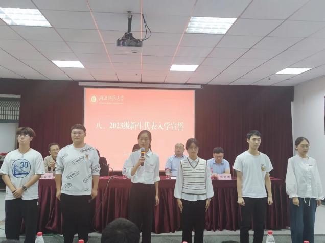 接下来老师们为2023级新生代表佩戴校徽,同时新生代表进行了入学宣誓。