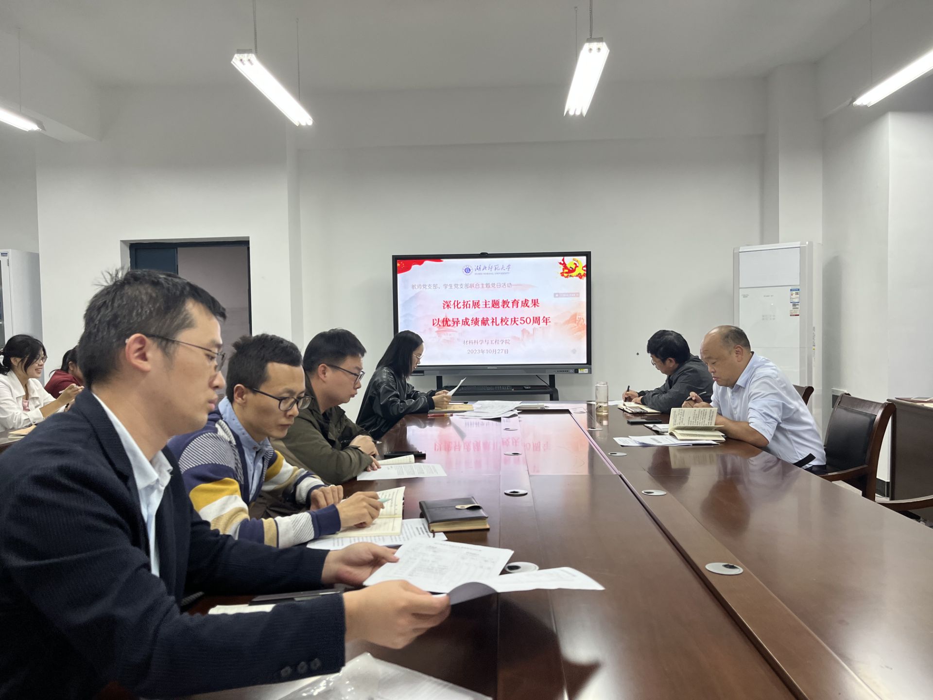 20231027日下午2:20,yl6809永利集团教师党支部和学生党支部召开全体党员大会,组织开展题为“深化拓展主题教育成果 以优异成绩献礼校庆50周年”联合主题党日活动。活动由教师党支部书记潘其云同志主持。
