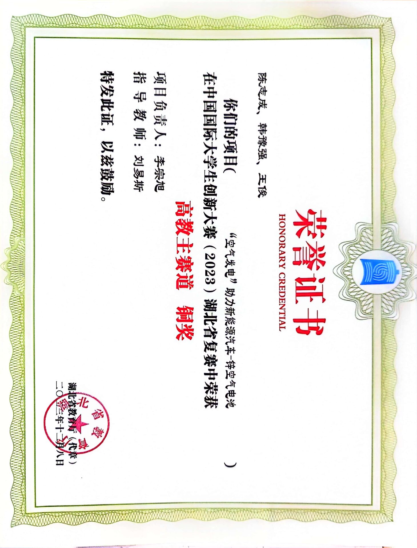 刘易斯老师指导的“空气发电”助力新能源汽车——锌空气电池项目也取得了优异成绩,荣获湖北省高教主赛道铜奖。该项目由学院2021级研究生李宗旭担任项目负责人,陈志成、韩豫强、王俊等同学共同参与。他们致力于研发锌空动力电池技术,通过优化电池结构和提升能量密度,为新能源汽车的发展注入了新的动力。这一项目的成功实施,不仅展现了学院在新能源技术领域的创新能力,也为新能源汽车产业的发展贡献了智慧。