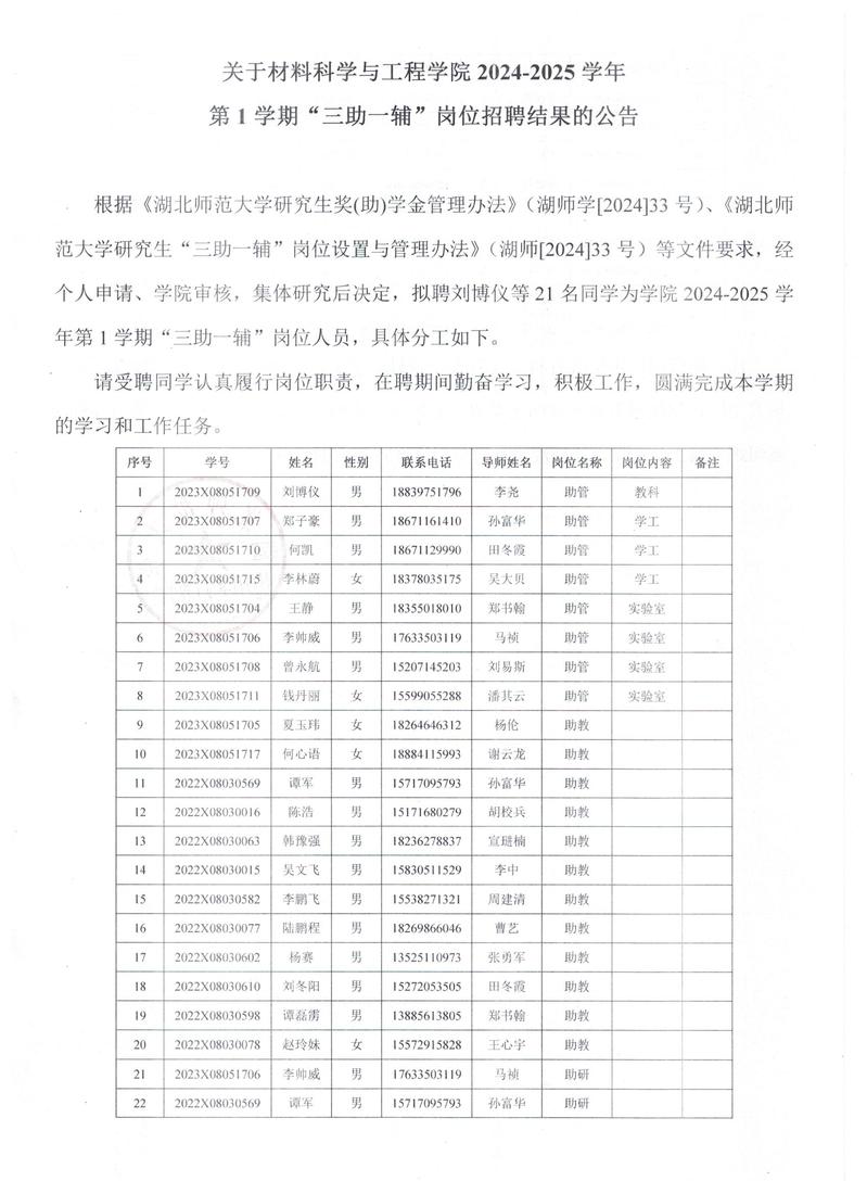 关于yl6809永利集团2024-2025学年第1学期“三助一辅”岗位招聘结果的公告