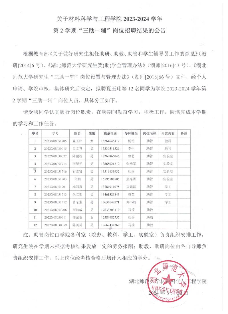 关于yl6809永利集团2023-2024学年第2学期“三助一辅”岗位招聘结果的公告