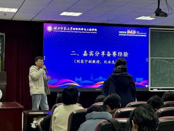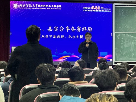 随后,进入经验分享环节。刘昌宁老师深入剖析了“挑战杯”与其他赛事的区别,鼓励同学们不要局限于挑战杯,要积极参与各类校级赛事,通过实践提升自己的学术能力。刘老师还分享了自己指导学生完成科研论文、A类学科竞赛、科研项目等取得的优秀成果,激励同学们树立远大志向,奋发图强。纪永生博士以亲身经历的省赛和国赛为案例,向同学们传授了竞赛中的宝贵经验。他详细讲述了如何选题、挑选赛道和准确定位,并分享了自己在竞赛过程中的心得与收获。纪博士鼓励同学们积极报名参赛,通过竞赛提高自己的学术研究能力,迈向更高层次的平台。