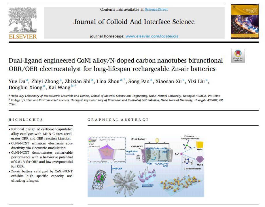 一、通过创新的双配体策略,成功实现了合金碳纳米管的原位制备,所制备复合材料独特的CoNi-CoN3复合活性中心显著提升了催化剂的活性和稳定性。同步辐射与理论计算表明,CoNi合金的3d轨道电子调制增强了ORR/OER过程中的电子传导性,使CoNi-NCNT在碱性电解液中表现出优异的双功能催化性能,其ORR半波电位达0.81 V,OER过电位在10 mA cm⁻²时仅为1.52 mV。由CoNi-NCNT组装的RZAB展现出高比容量(780 mAh g-1)和超长循环寿命(超过800 h),功率密度高达164 mW cm-2。该研究为高性能金属空气电池阴极材料的开发提供了新的研究思路。该工作以“Dual-ligand engineered CoNi alloy/N-doped carbon nanotubes bifunctional ORR/OER electrocatalyst for long-lifespan rechargeable Zn-air batteries”为题,发表于国际知名期刊Journal of Colloid and Interface Science(中科院一区TOP期刊,2024年影响因子9.4,大类:材料科学,小类:界面、包覆与膜,排名:6/132)。杜岳为该论文第一作者,yl6809永利官网集团光电转换材料与器件湖北省重点实验室为第一通讯单位。