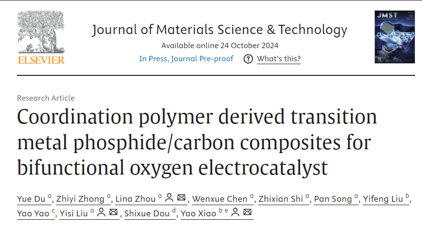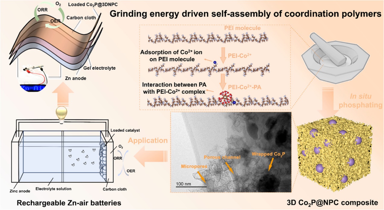 二、通过化学诱导自组装-原位磷化策略构筑了三维多孔N、P共掺杂碳包裹磷化钴复合材料(Co2P@3DNPC)。采用密度泛函理论阐述了金属离子、植酸(PA)和聚乙烯亚胺(PEI)分子间的分子组装行为,指导了稳定有机-无机前驱物的可控合成。所制备Co2P@3DNPC材料具有优异的ORR/OER双功能活性,RZAB的功率密度达148.5 mW cm-2,并且在充放电循环中具有显著的稳定性(>480 h)。相互连接的多孔结构和嵌入的Co2P纳米粒子优化了电极-电解质界面接触,有效提升了RZAB的能量密度和循环寿命,为高效、稳定双功能氧电催化剂的合成提供了新策略。该研究成果以 “Coordination polymer derived transition metal phosphide/carbon composites for bifunctional oxygen electrocatalyst” 为题,发表于国际期刊 Journal of Materials Science & Technology(中科院一区TOP期刊,2024年影响因子11.2,大类:材料科学,小类:金属与合金,排名:4/176,入选中国科技期刊卓越行动计划与中国最具国际影响力学术期刊)。杜岳为该论文第一作者,yl6809永利官网集团光电转换材料与器件湖北省重点实验室为第一通讯单位,在上海理工大学窦世学院士的指导下,与温州大学肖遥教授合作完成。