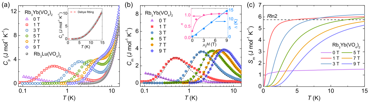 进展一:由于离子半径相似,真实材料中往往存在离子无序占位而导致的结构无序问题,被认为是研究量子磁性系统本征物理的一大障碍。为此,马祯团队设计开发了两种新型的三角晶格稀土材料Rb3Yb(VO4)2和Cs3Yb(VO4)2。通过对材料进行极低温的比热和非弹性中子散射研究,发现自旋在低温下仍然没有建立长程磁性,而是保持量子顺磁行为。同时,在温度低至100 mK以下,系统中仍然存在大量的低温磁熵,且会受到磁场的连续调制,具有较大的磁卡效应。该工作为探索通过绝热去磁制冷技术,实现mK量级的极低温制冷环境提供一个潜在平台。研究成果以“Magnetically disordered ground state in the triangular-lattice antiferromagnets Rb3Yb(VO4)2 and Cs3Yb(VO4)2”为题,发表于物理学权威期刊Physical Review B [PRB 111, 155141 (2025)]。材料学院马祯博士为论文第一兼通讯作者,南京大学温锦生教授为共同通讯作者。