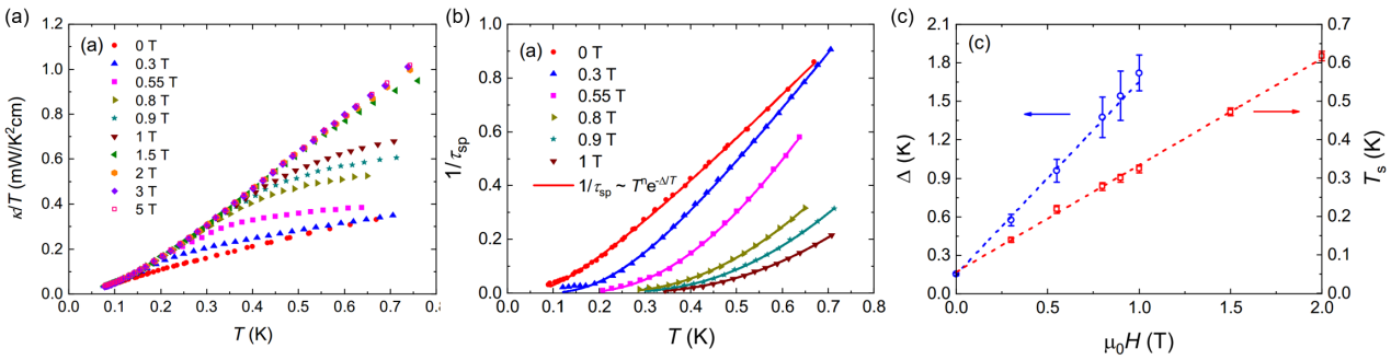 进展三:在进展二的基础上,马祯团队继续对PrMgAl11O19进行了极低温热导率的研究。结果显示,系统中除了声子热导之外,零场下表征量子自旋液体态的分数化磁激发对热导几乎没有贡献,排除了系统中出现具有巡游性的准粒子激发的可能,这似乎和上述比热以及中子散射的结果相矛盾。然而,通过对不同磁场下热导率数据的进一步分析得知,声子热导会受到有能隙(~0.15 K)的集体磁激发模的强烈散射,且能隙值与外加磁场大小具有线性依赖关系。以上结果表明,该系统实际是一个有能隙的Z2型量子自旋液体。研究成果以“Gapped quantum spin liquid in a triangular-lattice Ising-type antiferromagnet PrMgAl11O19”,发表于物理学权威期刊Physical Review Research [PRR 6, 043147 (2024)]。我校材料学院马祯博士和复旦大学李世燕教授为论文共同通讯作者。