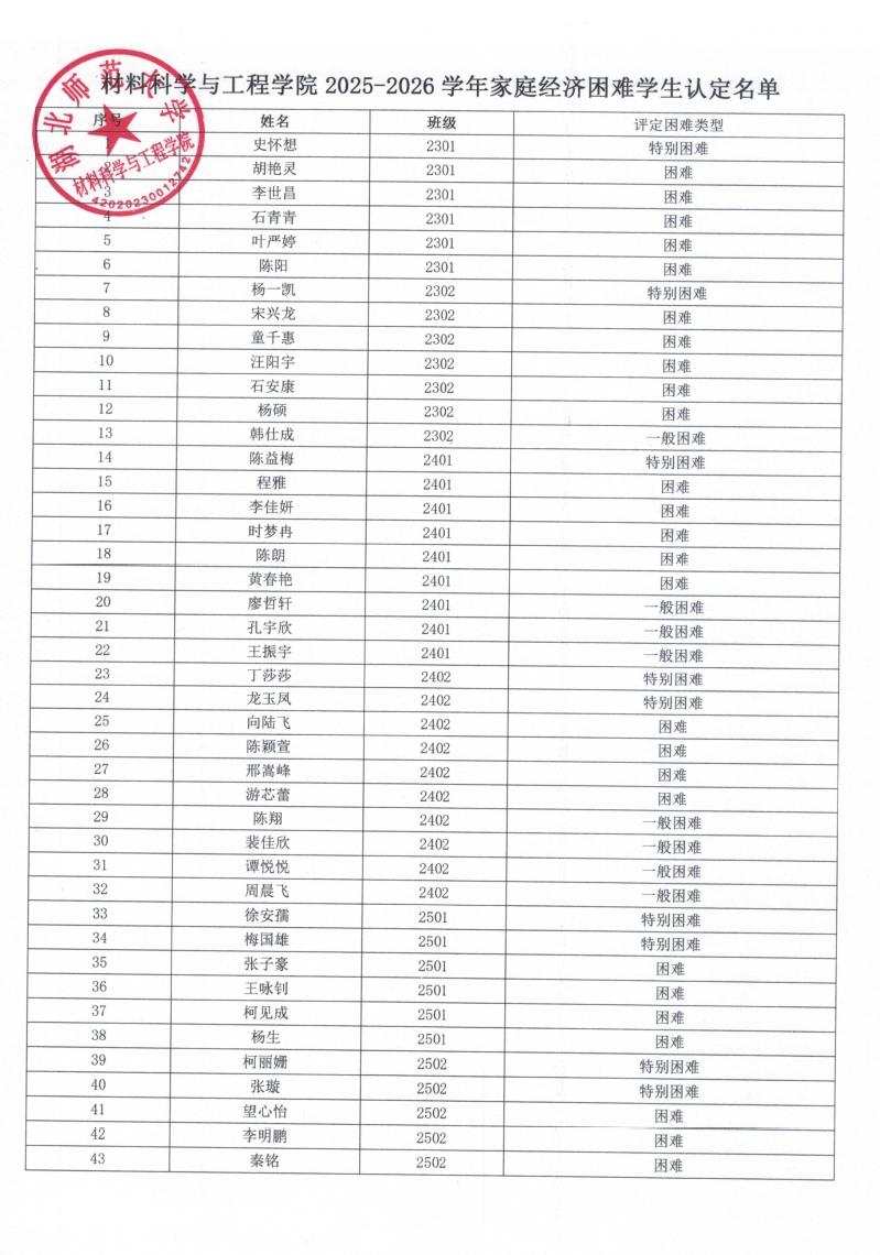 yl6809永利集团关于2025-2026学年家庭经济困难学生认定结果公示