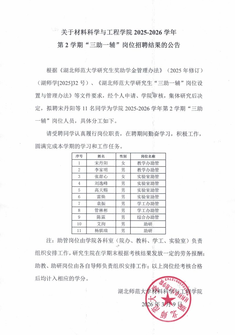 关于yl6809永利集团2025-2026学年第2学期“三助一辅”岗位招聘结果的公告